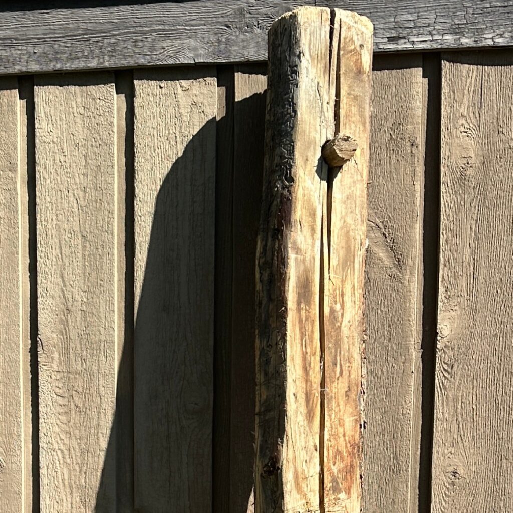 The timber post Michael sold me is hand-pealed, Douglas Fir or Lodgepole Pine. There is a wooden dowel that Nestor Hryciuk augured through one end.