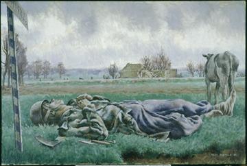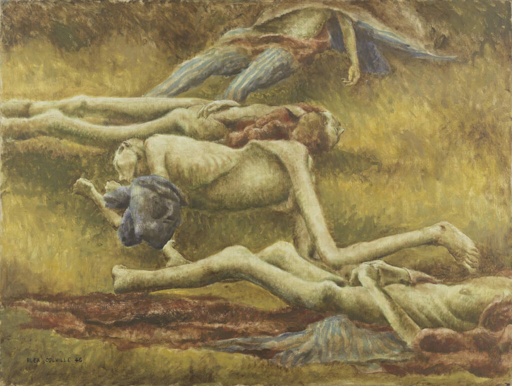 Colville’s wartime paintings graphically depict the horrors he experienced while traveling with the 3rd Canadian Army Division.