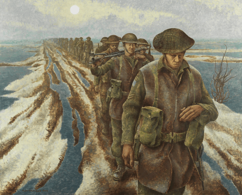 Alex Coleville, originally from Amherst, Nova Scotia, enlisted in the Canadian infantry in 1942 and served in a combat capacity until his talents as an artist were revealed. Coleville was elevated to the rank of lieutenant and assigned duties as a war correspondent and artist.
