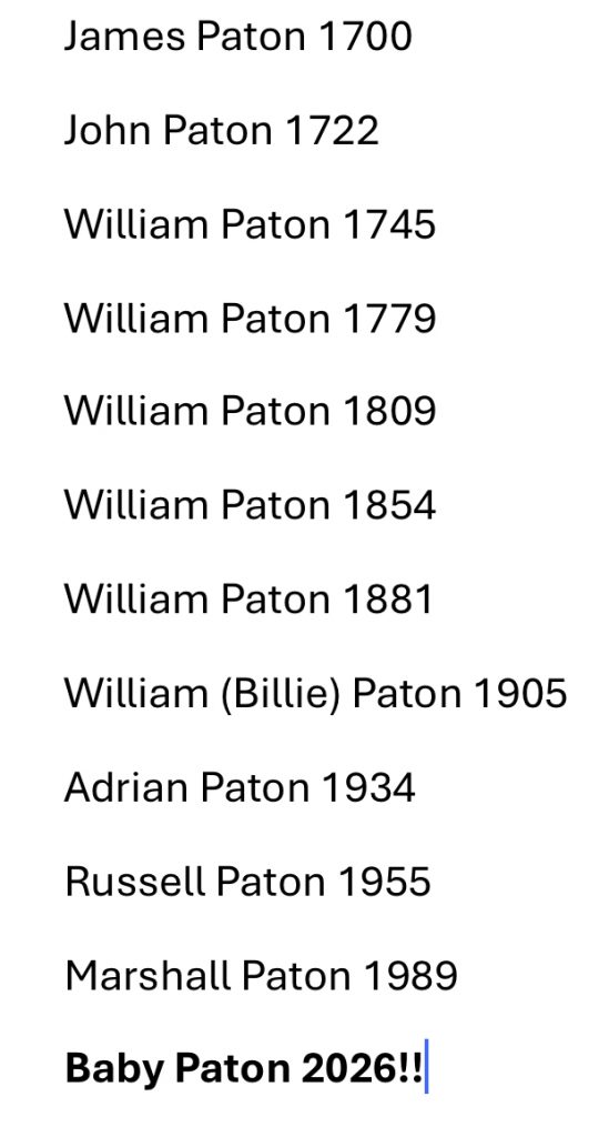 Baby Paton will be the twelfth in a lineage of male Paton’s starting in the year 1700. His oldest known ancestor was named James, and his son was John, followed by six generations of William’s. Any one of those names would be suitable.