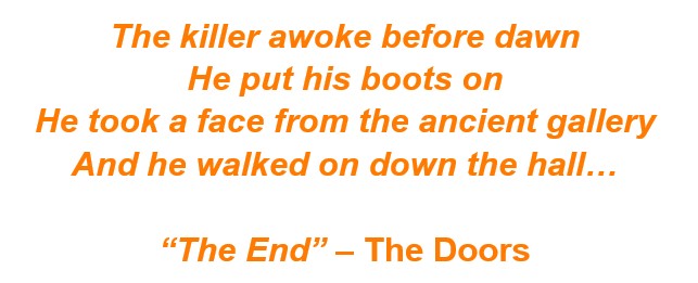 The Bergmann brothers were the only other patrons in Chan’s at the time, so one of them must have selected The Doors’ song. I nodded at Teddy the second Bergmann brother, as we found our seats. Teddy was in my class at school; we weren’t close, but we had a passing acquaintance.
